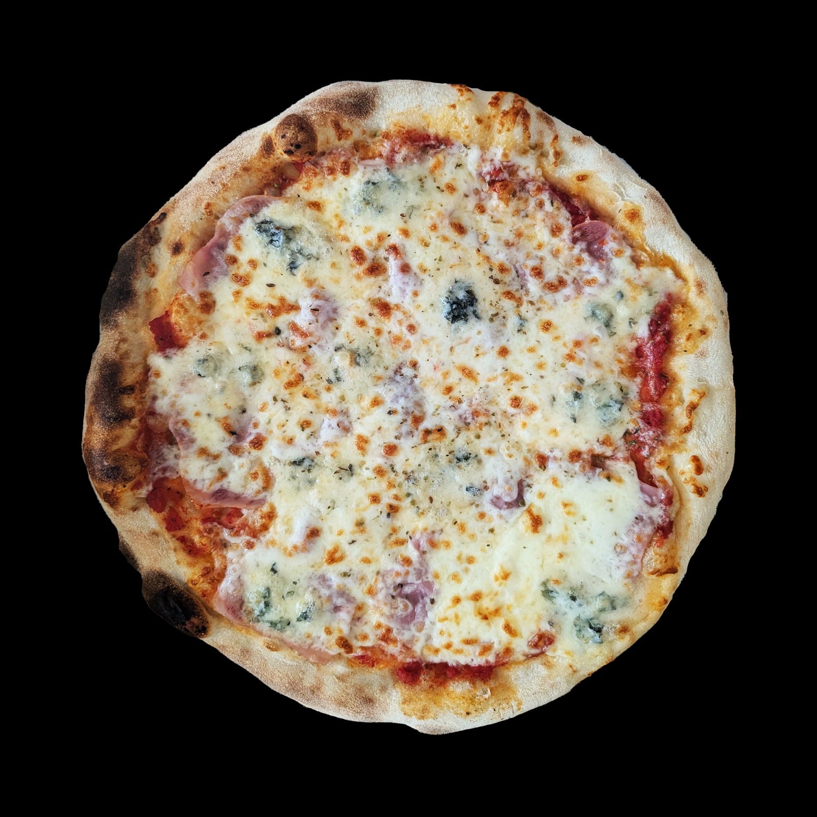Ingrediente: sos de roșii, mozzarella, prosciutto cotto, gorgonzola, ulei de măsline