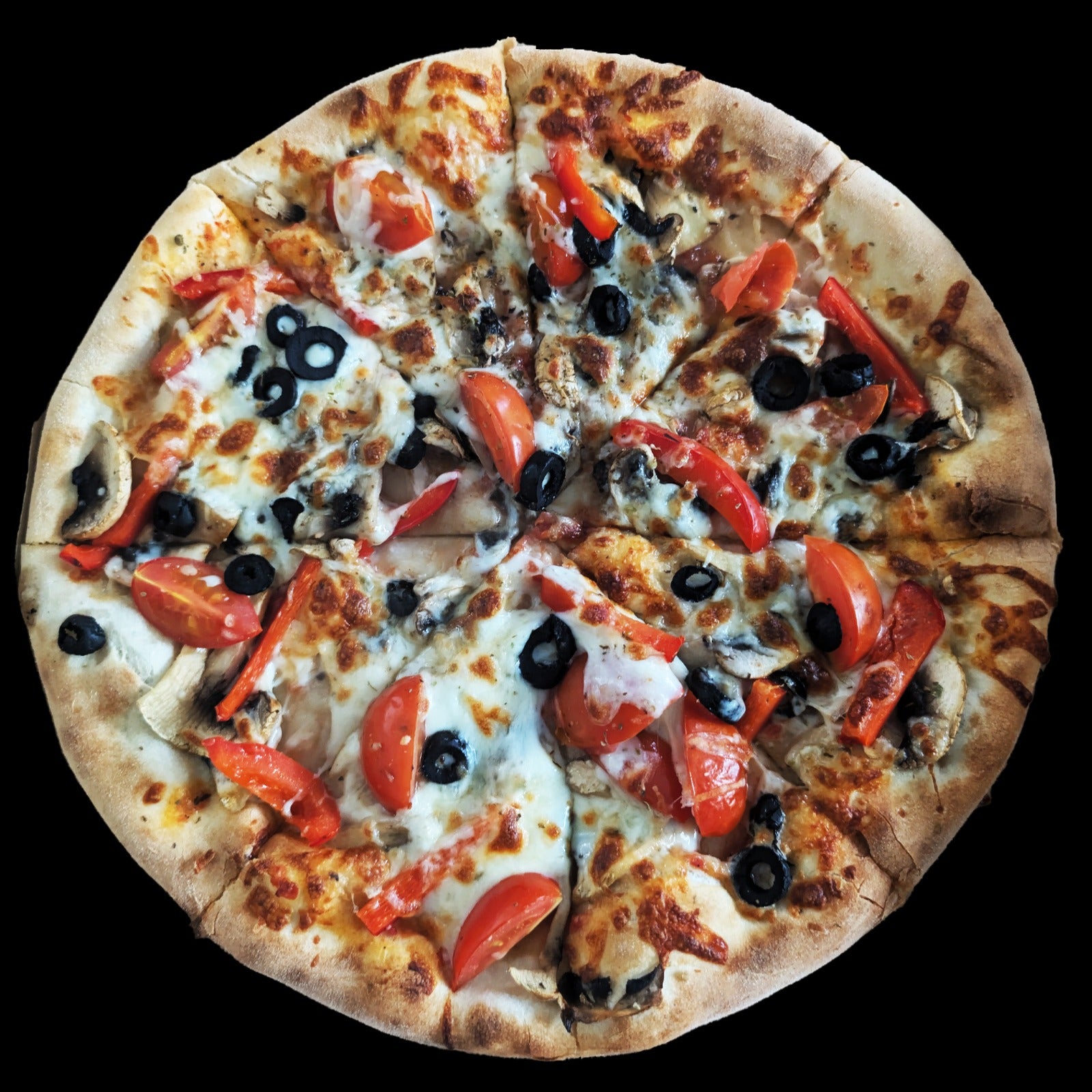 Ingrediente: sos de roșii, măsline, ciuperci, roșii cherry, ardei gras, porumb, vinete, zucchini, ceapă roșie, ulei de măsline